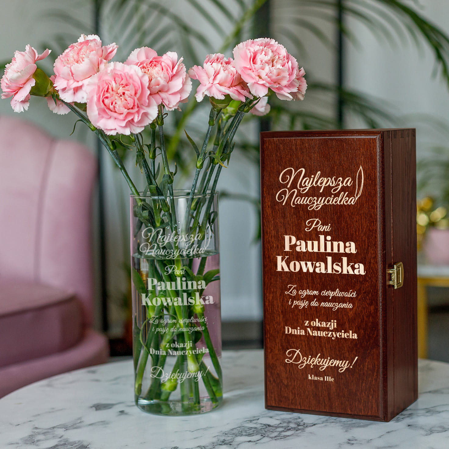 SZKLANY WAZON NA KWIATY W ELEGANCKIEJ SKRZYNCE Z GRAWEREM - IDEALNY PREZENT Z OKAZJI DNIA NAUCZYCIELA!