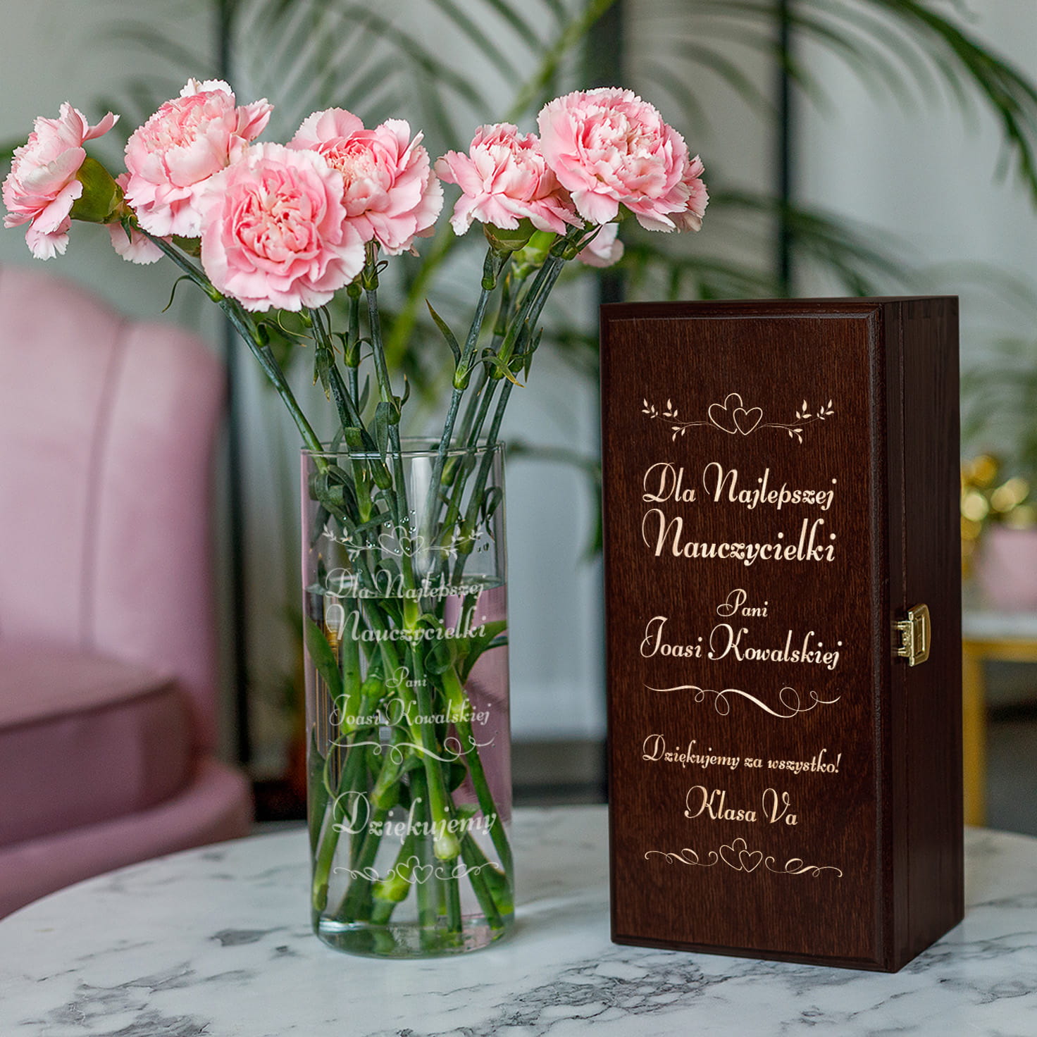 SZKLANY WAZON NA KWIATY W ELEGANCKIEJ SKRZYNCE Z GRAWEREM - IDEALNY PREZENT Z OKAZJI DNIA NAUCZYCIELA!