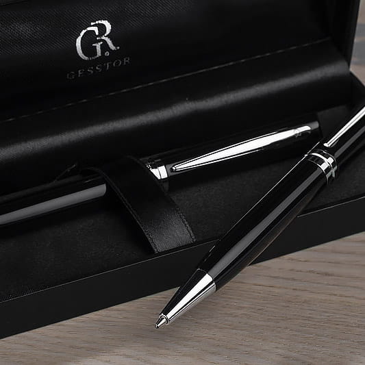 Klasyczny piśmienniczy zestaw marki Gesstor z możliwością wykonania personalizowanego grawerowania, będzie idealnym upominkiem np. z okazji urodzin.