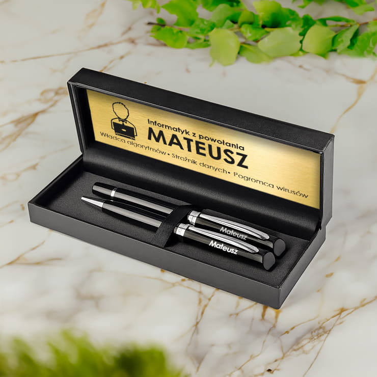 Spraw informatykowi gustowny prezent, wręczając personalizowany upominek w formie grawerowanego zestawu piśmienniczego.