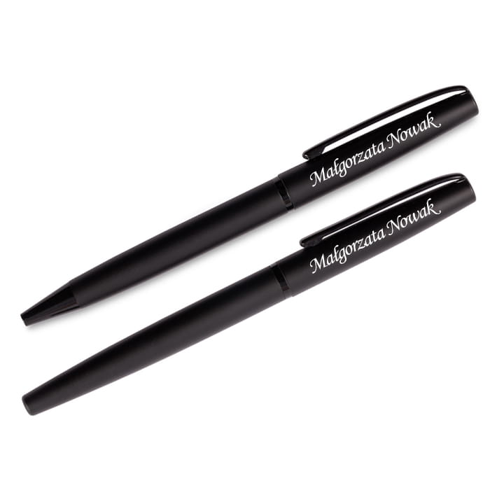 Zestaw piśmienniczy wyróżniający się nowoczesnym designem zawierający długopis oraz pióro kulkowe. Pakowany w upominkowe opakowanie. Wszystkie elementy zestawu posiadają matowe wykończenie.