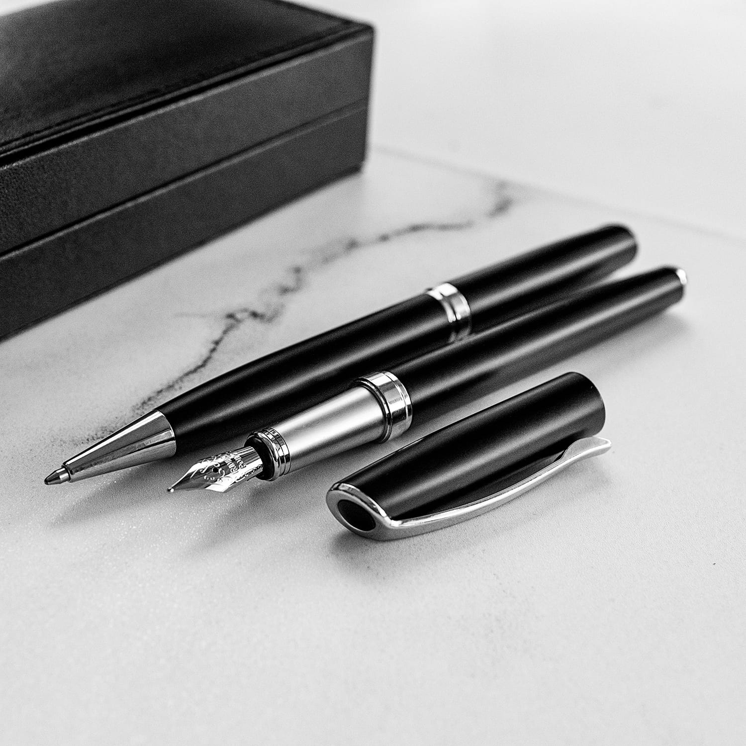 Zestaw piśmienniczy o klasycznej elegancji zawierający długopis oraz pióro kulkowe. Zapakowany w pudełko wykonane z ekoskóry. Wszystkie elementy zestawu oznaczone subtelnym logo marki GESSTOR oznaczającej produkty o wyjątkowej jakości i pięknym wzornictwie.