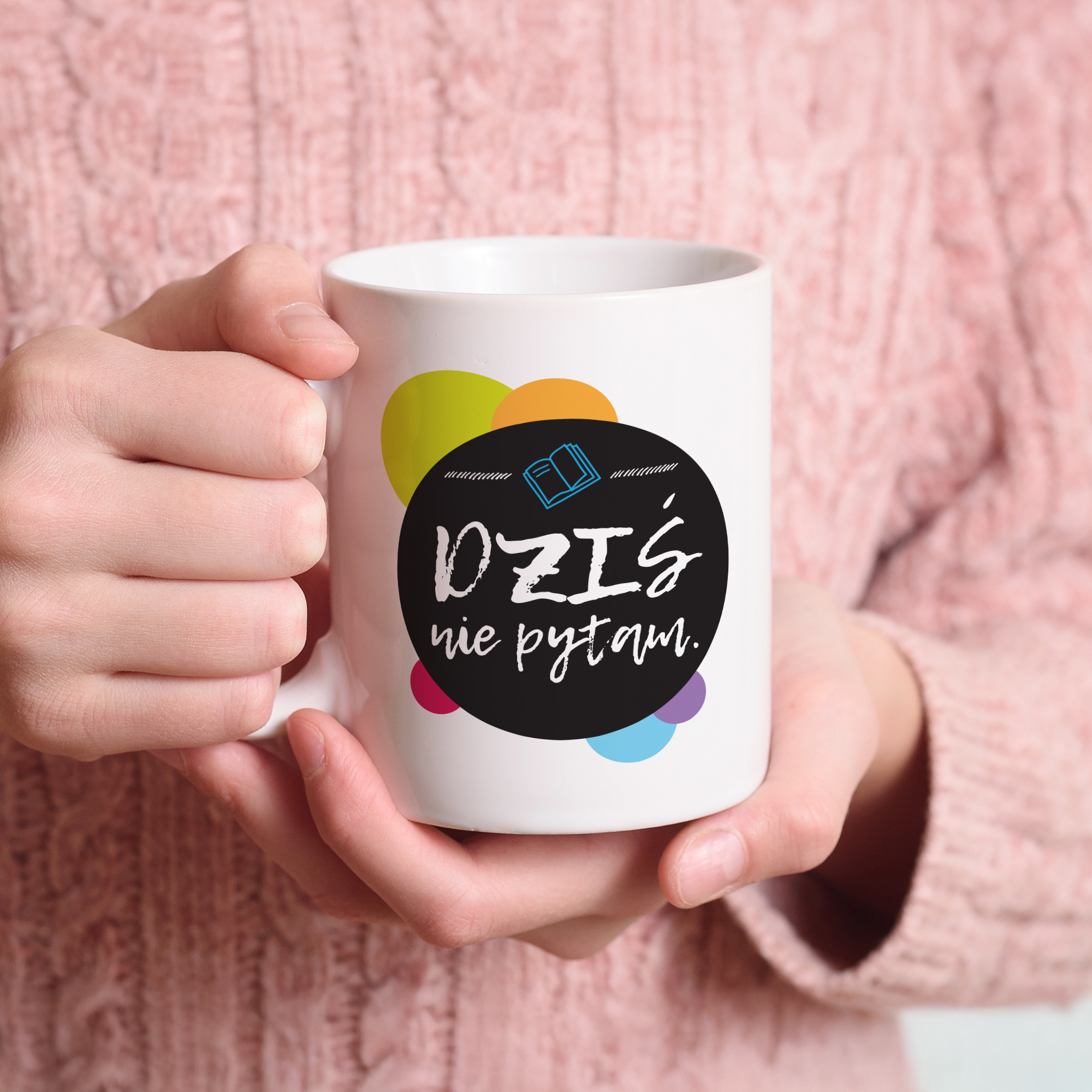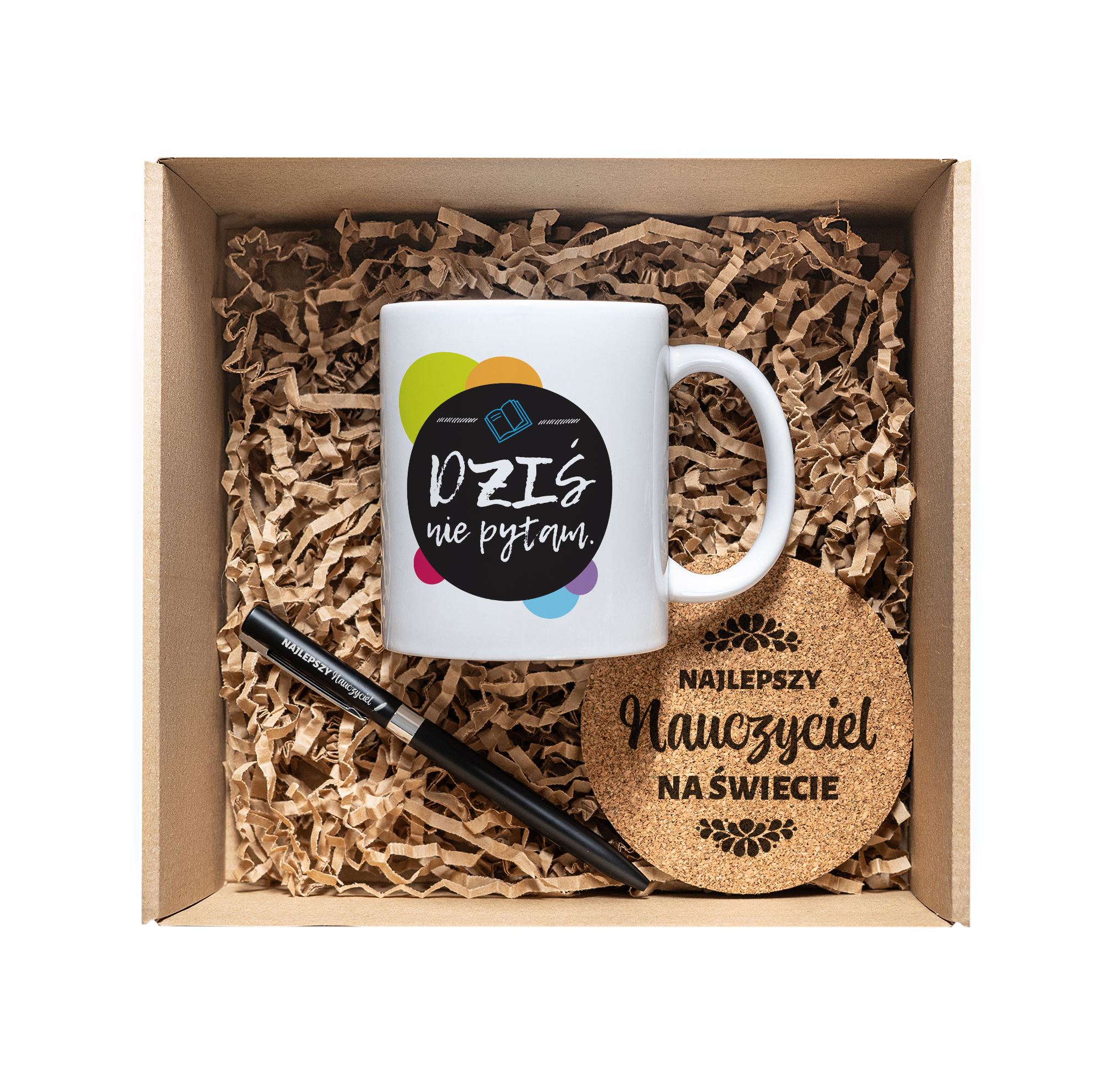 Zestaw dla Nauczyciela - Kubek z Czarnym Długopisem i Podkładką Na Dzień Nauczyciela- Dziś Nie Pytam