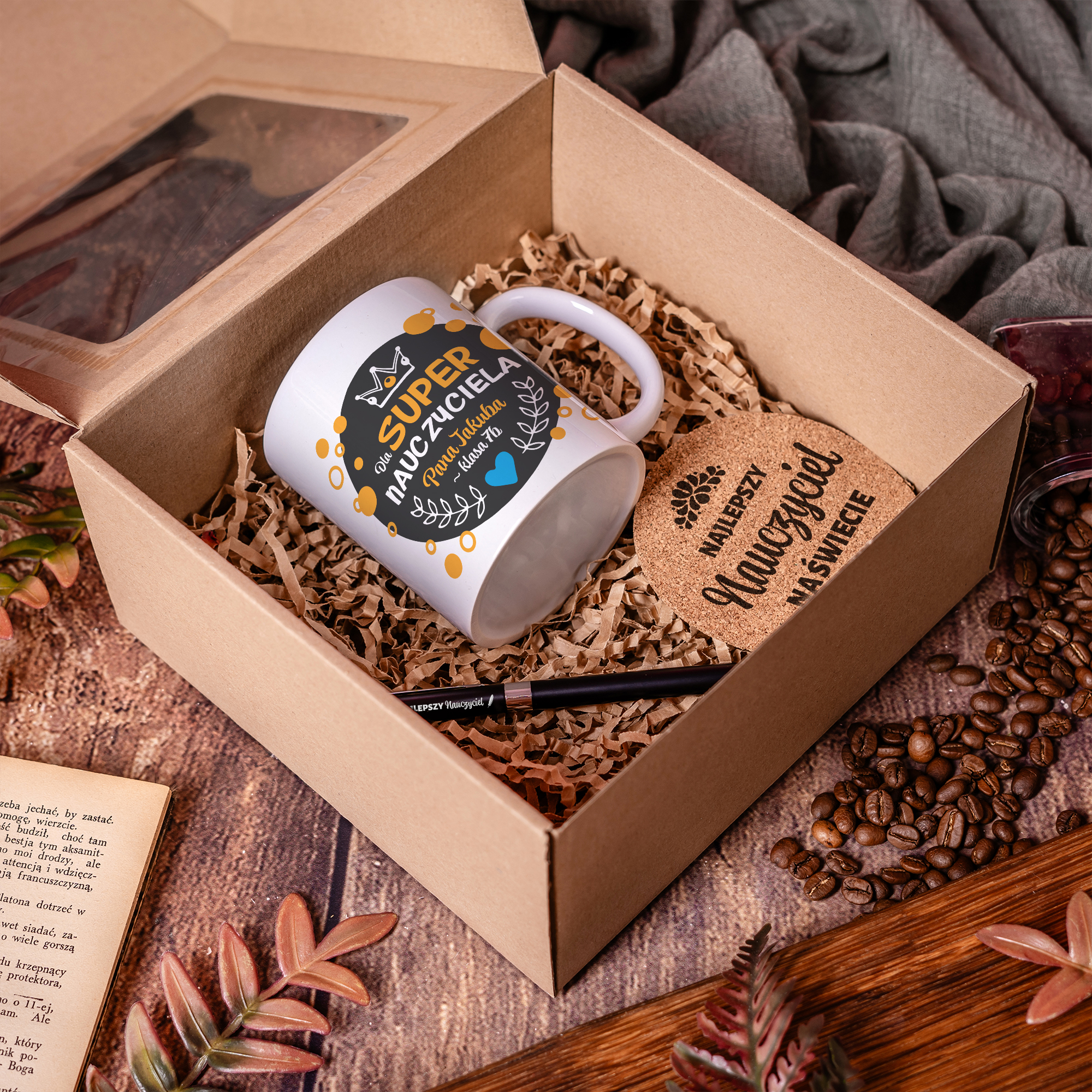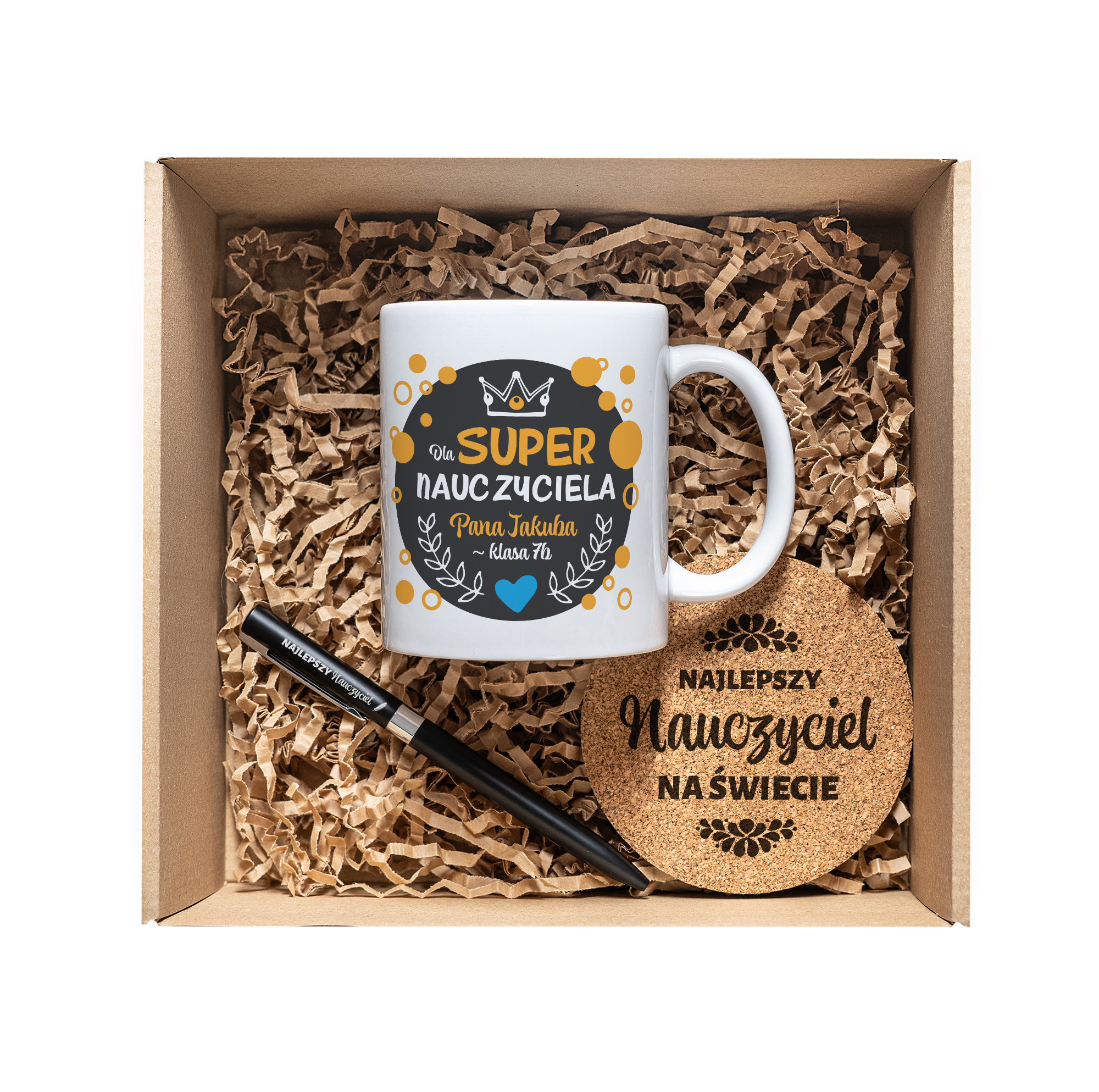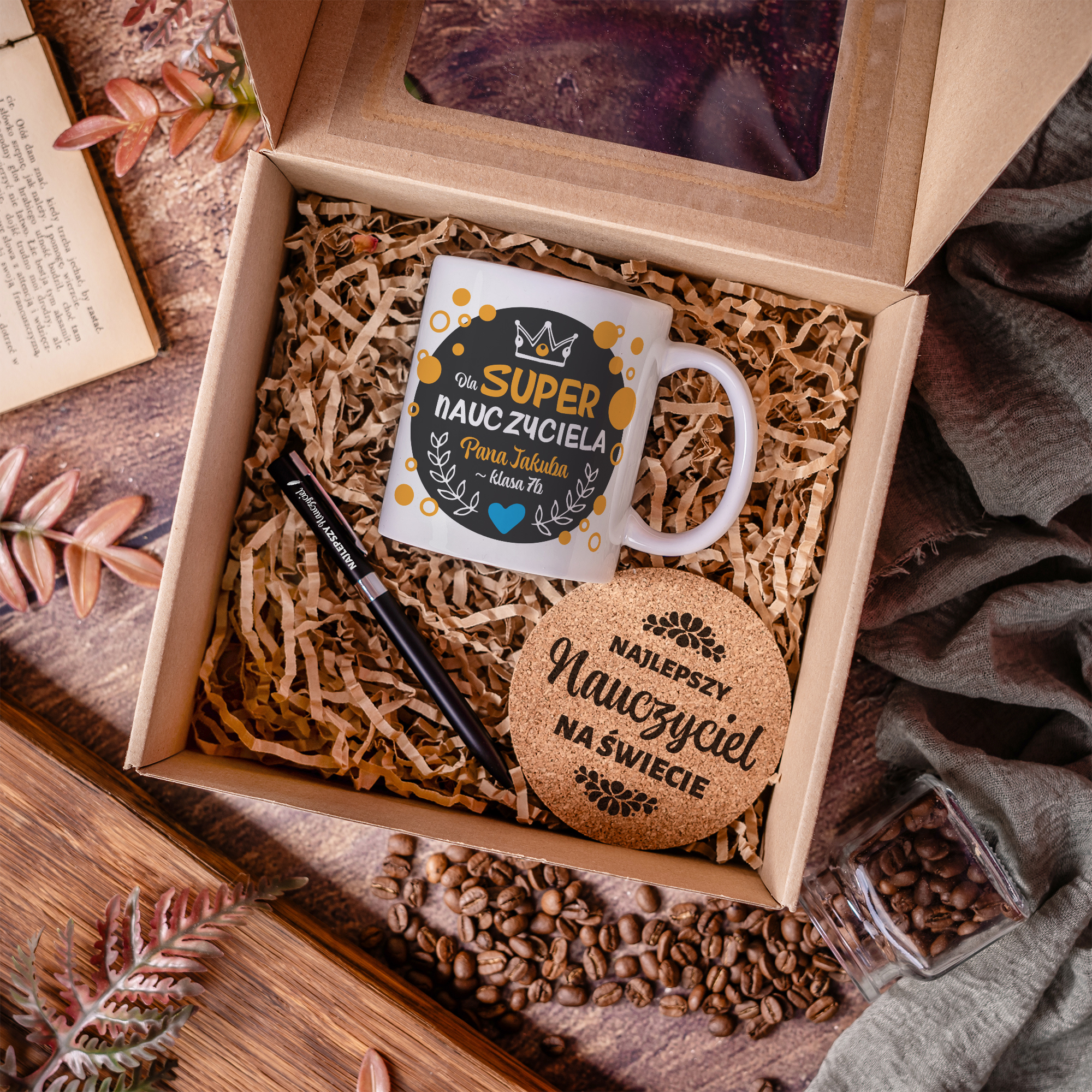 Zestaw dla Nauczyciela - Kubek z Czarnym Długopisem i Podkładką Na Dzień Nauczyciela- Kubek Super Nauczyciela