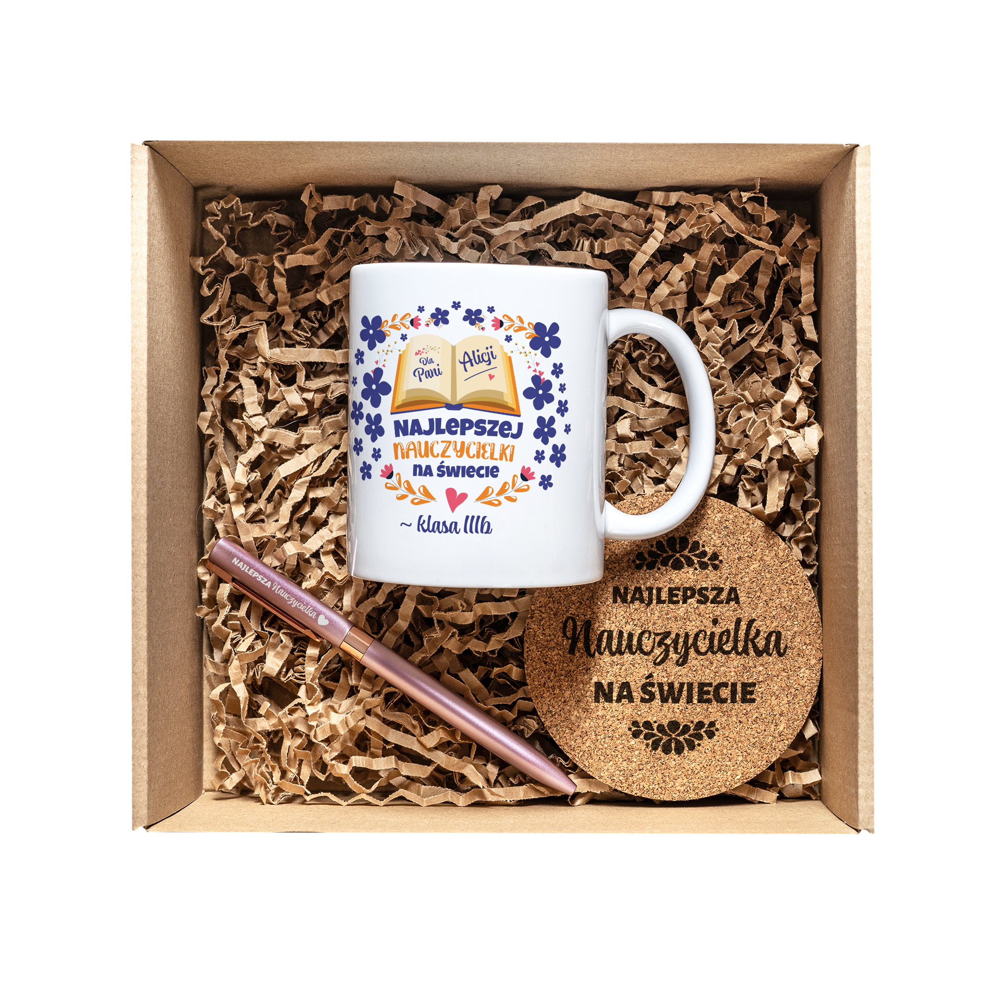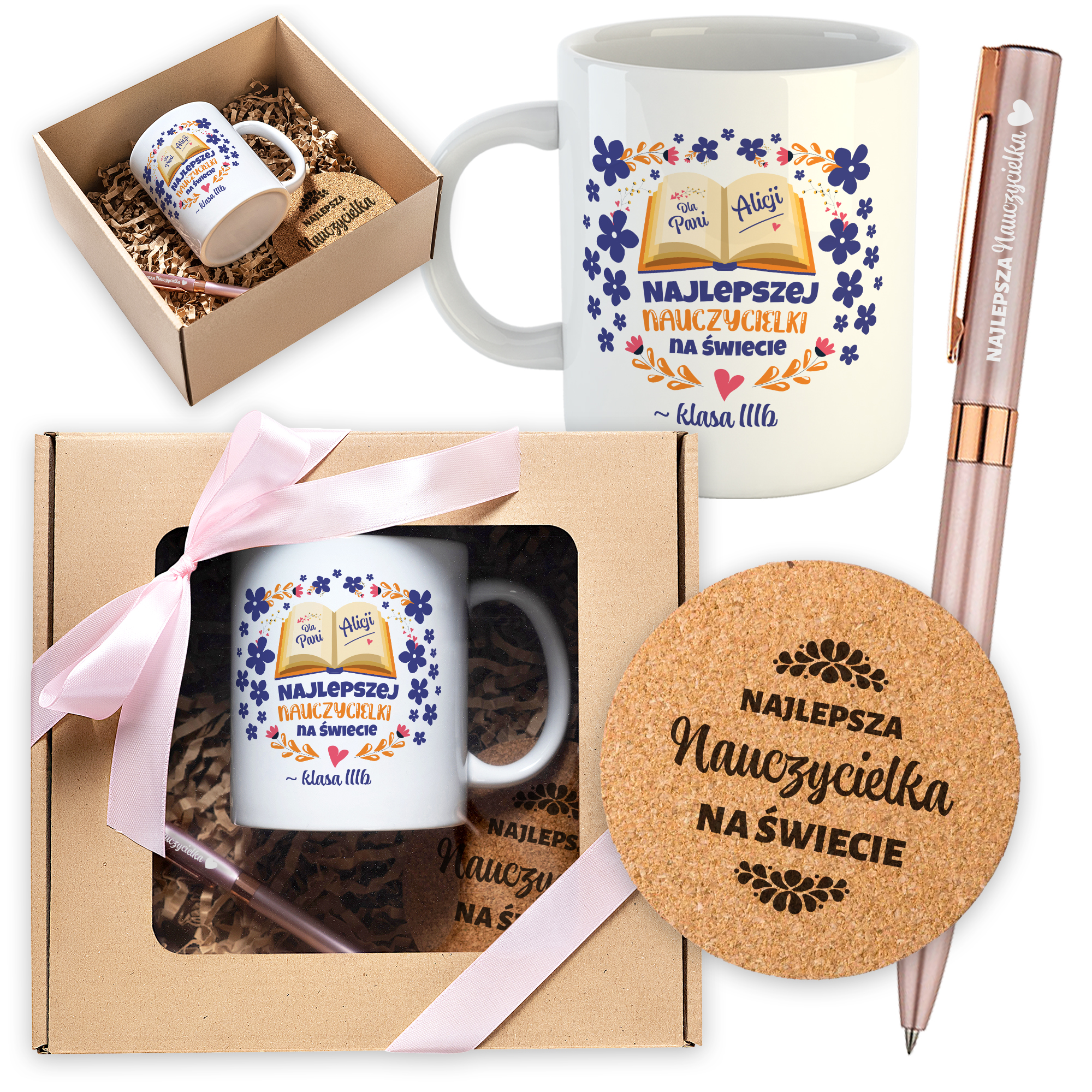 ZESTAW PREZENTOWY DLA NAUCZYCIELKI - KUBEK, DŁUGOPIS I PODKŁADKA