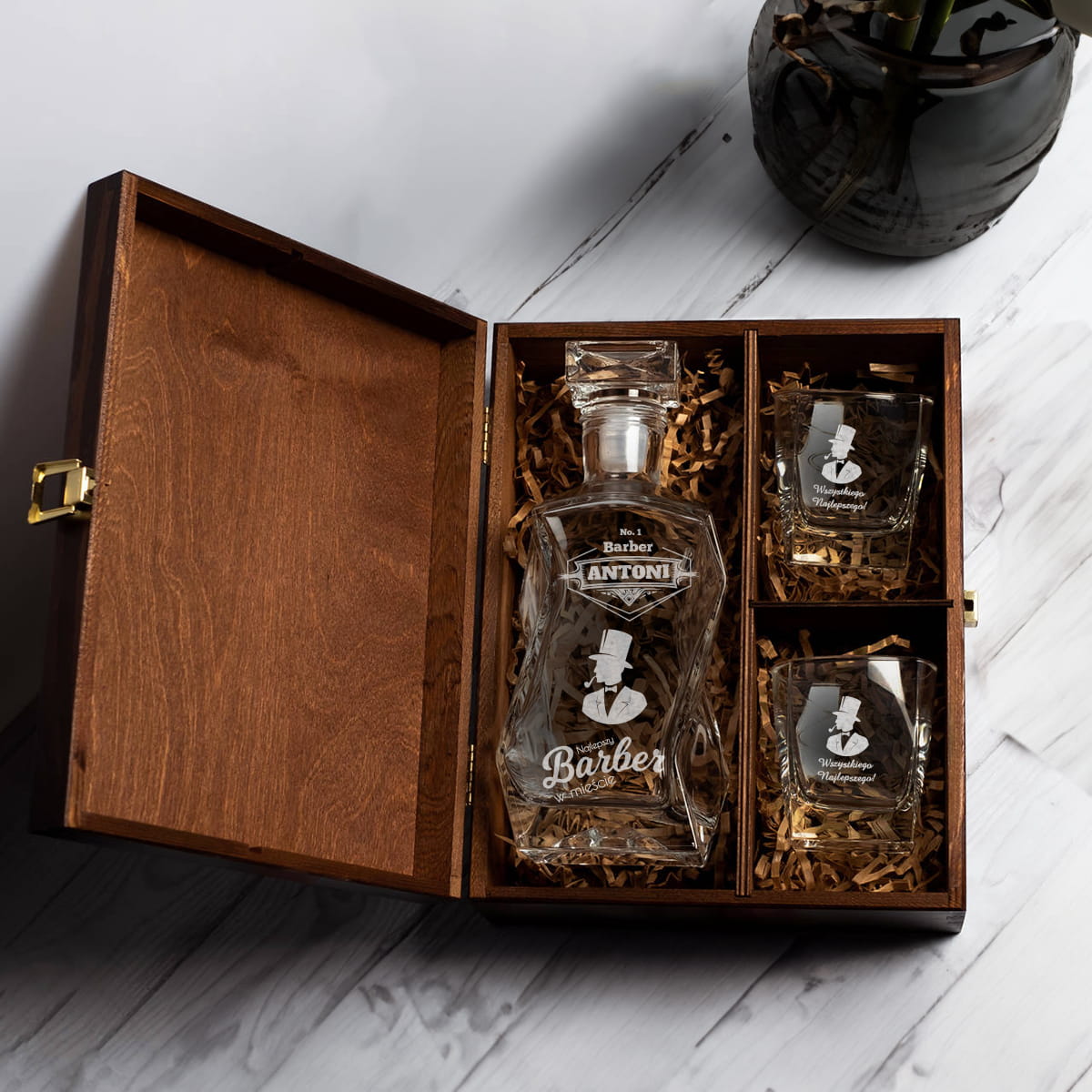 Karafka w skrzynce z dwoma szklankami dla barbera – Elegancki zestaw, który łączy styl i funkcjonalność, idealny dla każdego mistrza strzyżenia. Wykonana z wysokiej jakości szkła karafka, umieszczona w stylowej, drewnianej skrzynce, to doskonały sposób na celebrowanie chwil relaksu po długim dniu w salonie. Dwie szklanki dołączone do zestawu sprawiają, że jest to idealny prezent, zarówno do użytku własnego, jak i do dzielenia się z bliskimi. Dodaj klasy i elegancji do swojego salonu lub domu dzięki temu wyjątkowemu zestawowi.