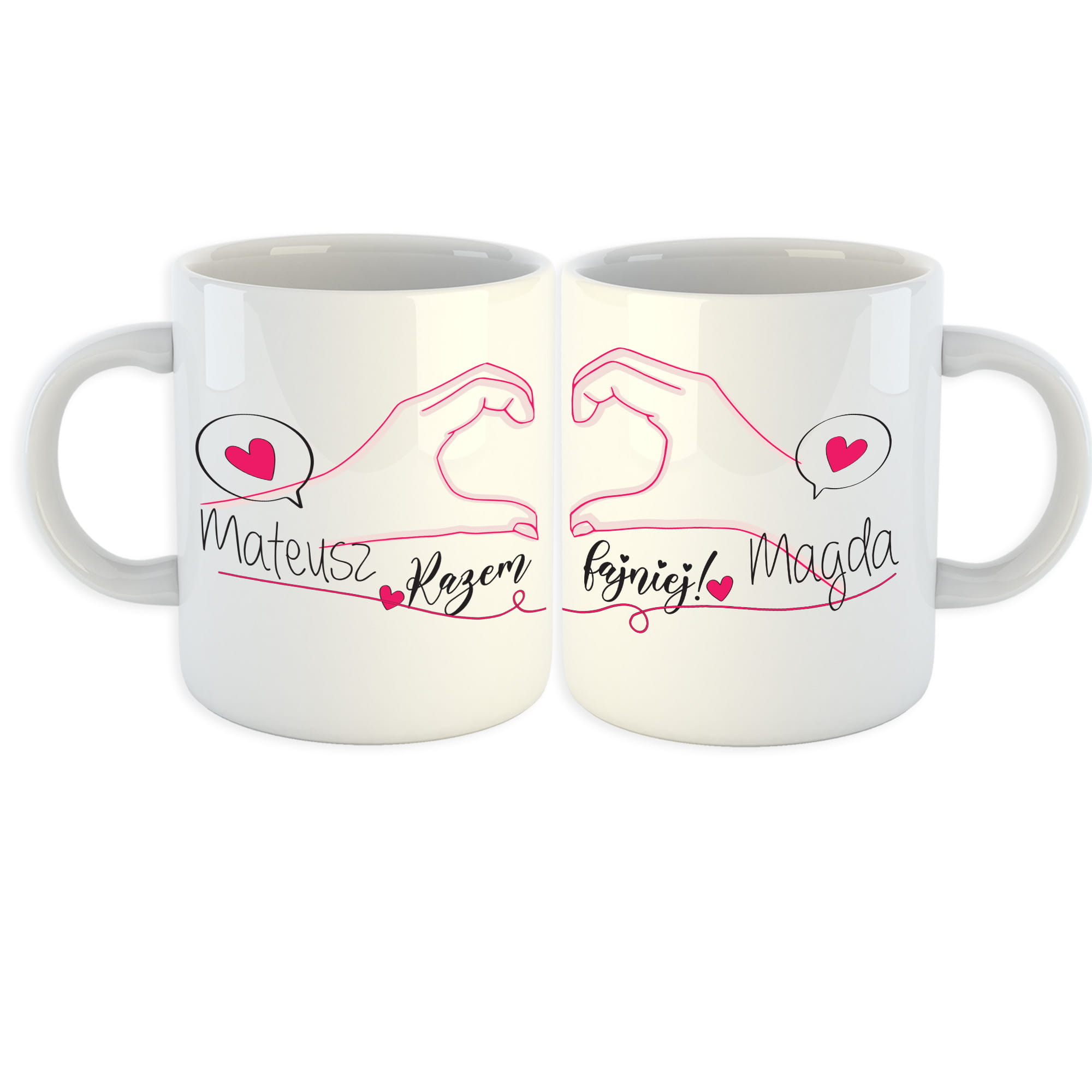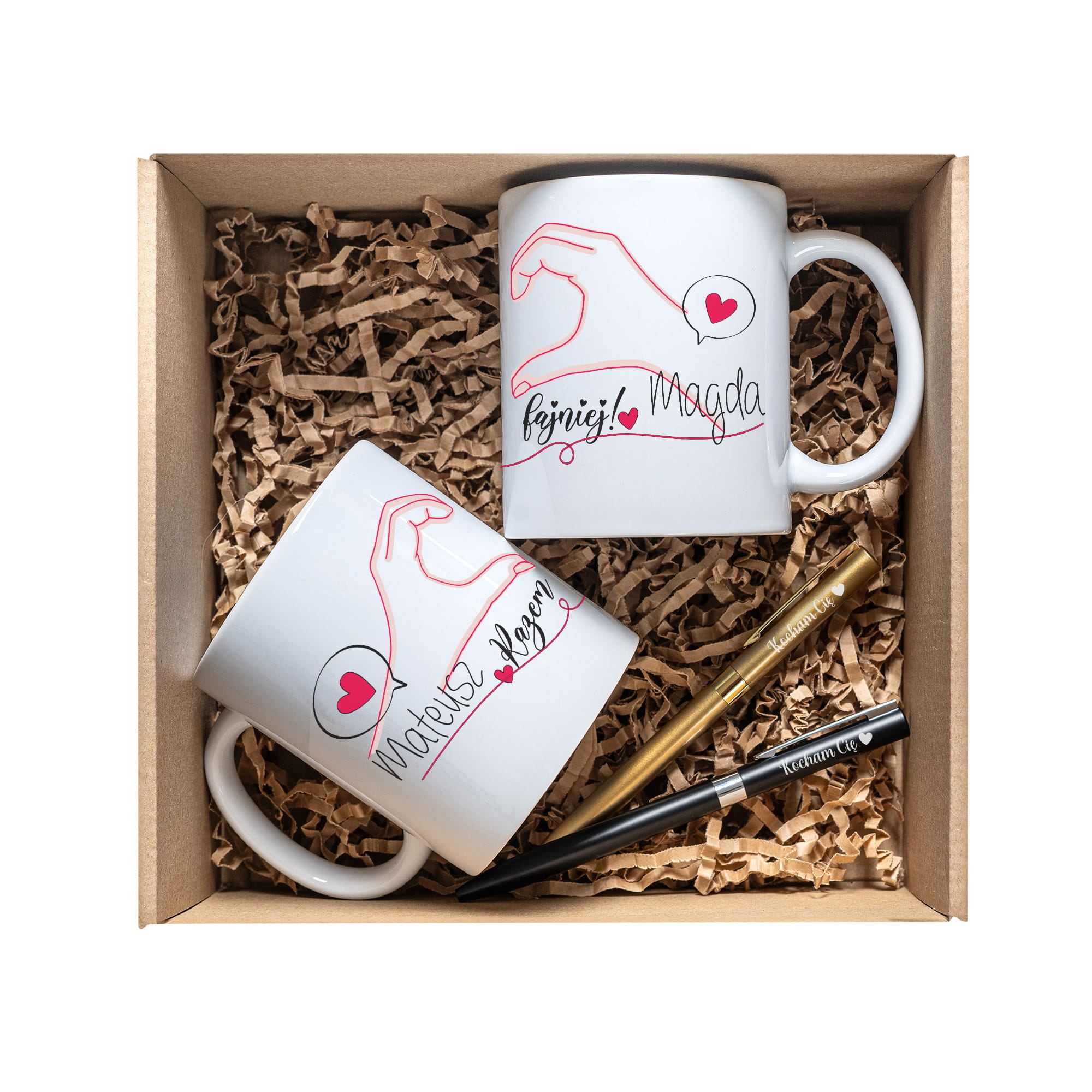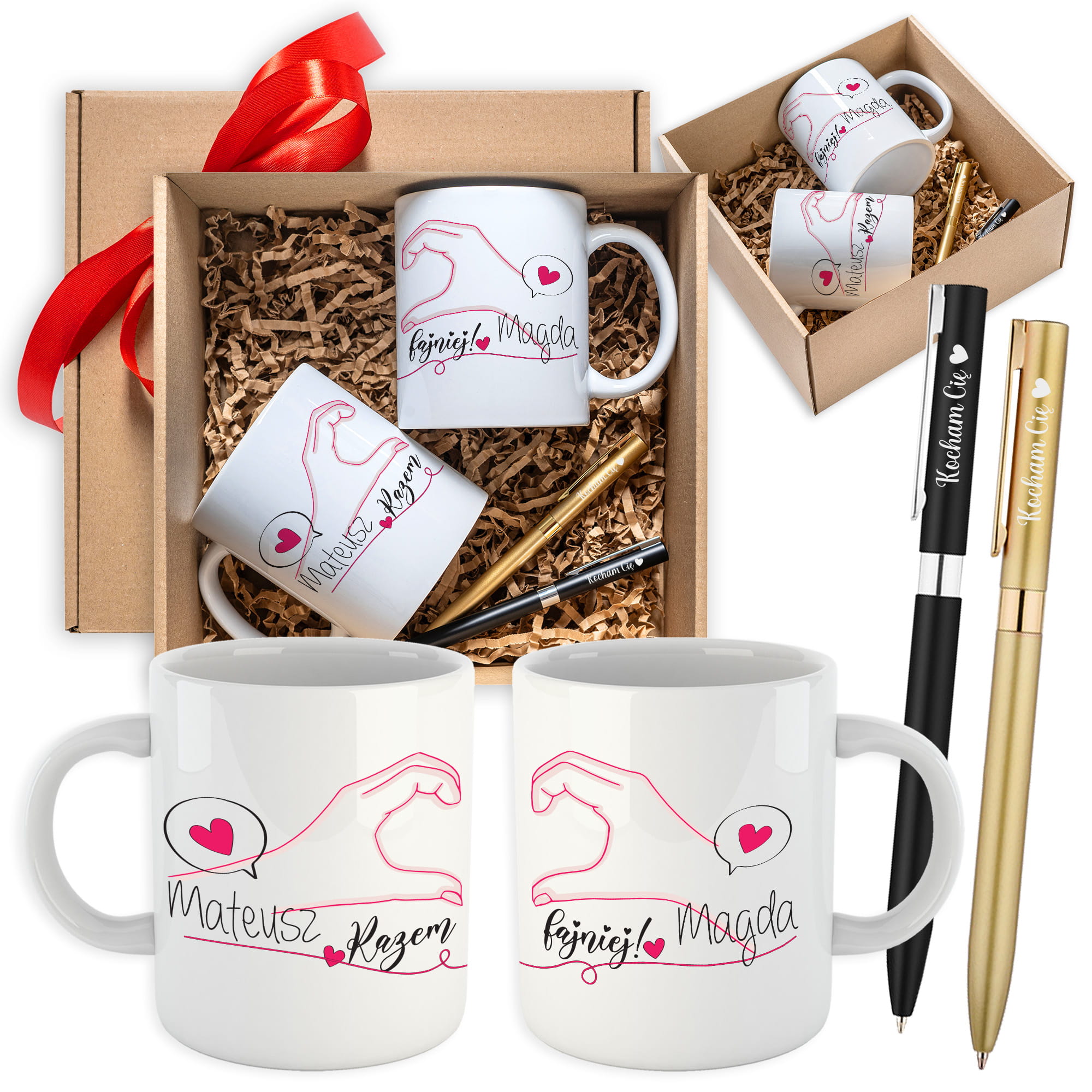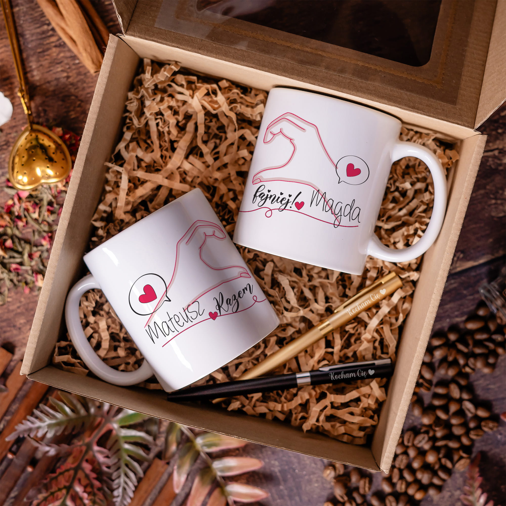 Zestaw prezentowy na Walentynki - Komplet Kubków z Imionami + Długopisy z Grawerem - Razem Fajniej Dłonie