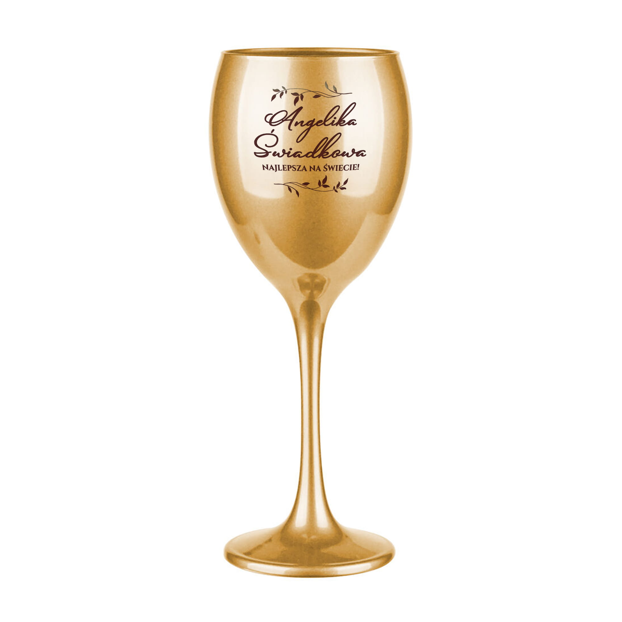 - Kieliszek do wina z grawerem w kolorze złotym – idealny do delektowania się ulubionym winem w domowym zaciszu, a personalizowany grawer na złotej powierzchni sprawia, że jest to idealny prezent na urodziny, rocznicę czy inne ważne wydarzenie.