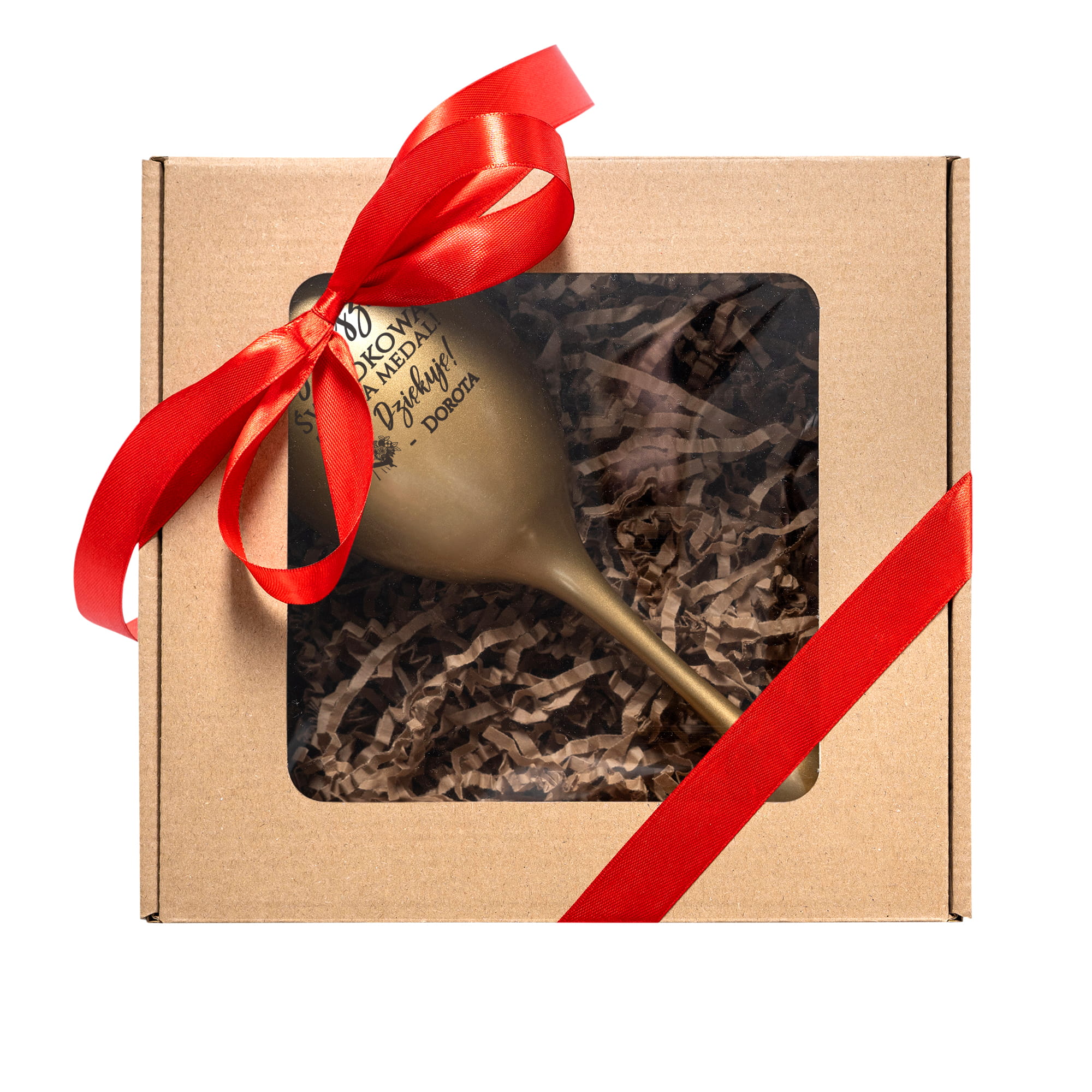 - Wypełnienie z eko wiórków – wnętrze pudełka wypełniamy ekowiórkami, aby kieliszek ładnie się prezentował i był zabezpieczony przed wstrząsami w momencie wręczania prezentu.