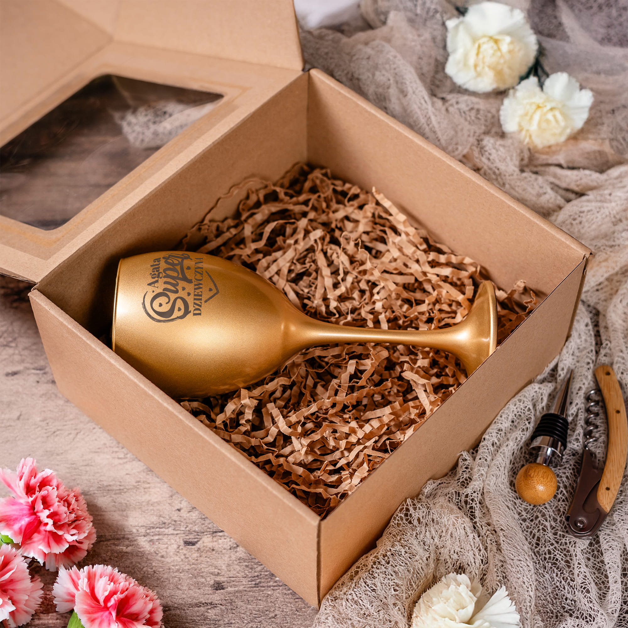 - Wypełnienie z eko wiórków – wnętrze pudełka wypełniamy ekowiórkami, aby kieliszek ładnie się prezentował i był zabezpieczony przed wstrząsami w momencie wręczania prezentu.