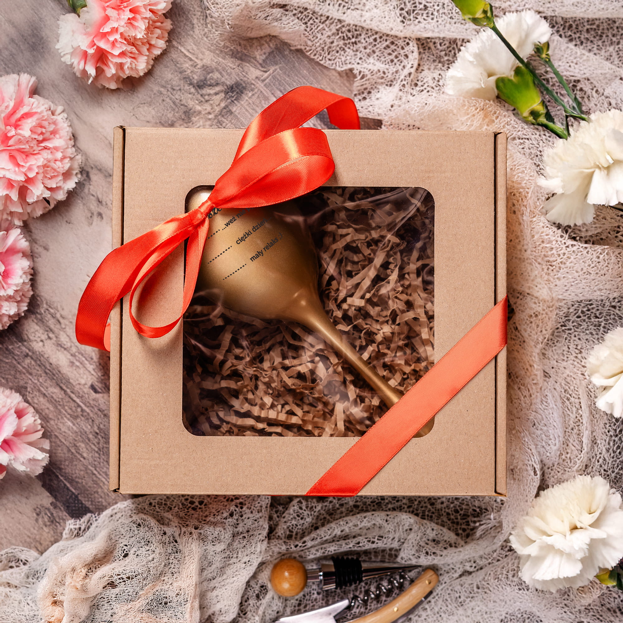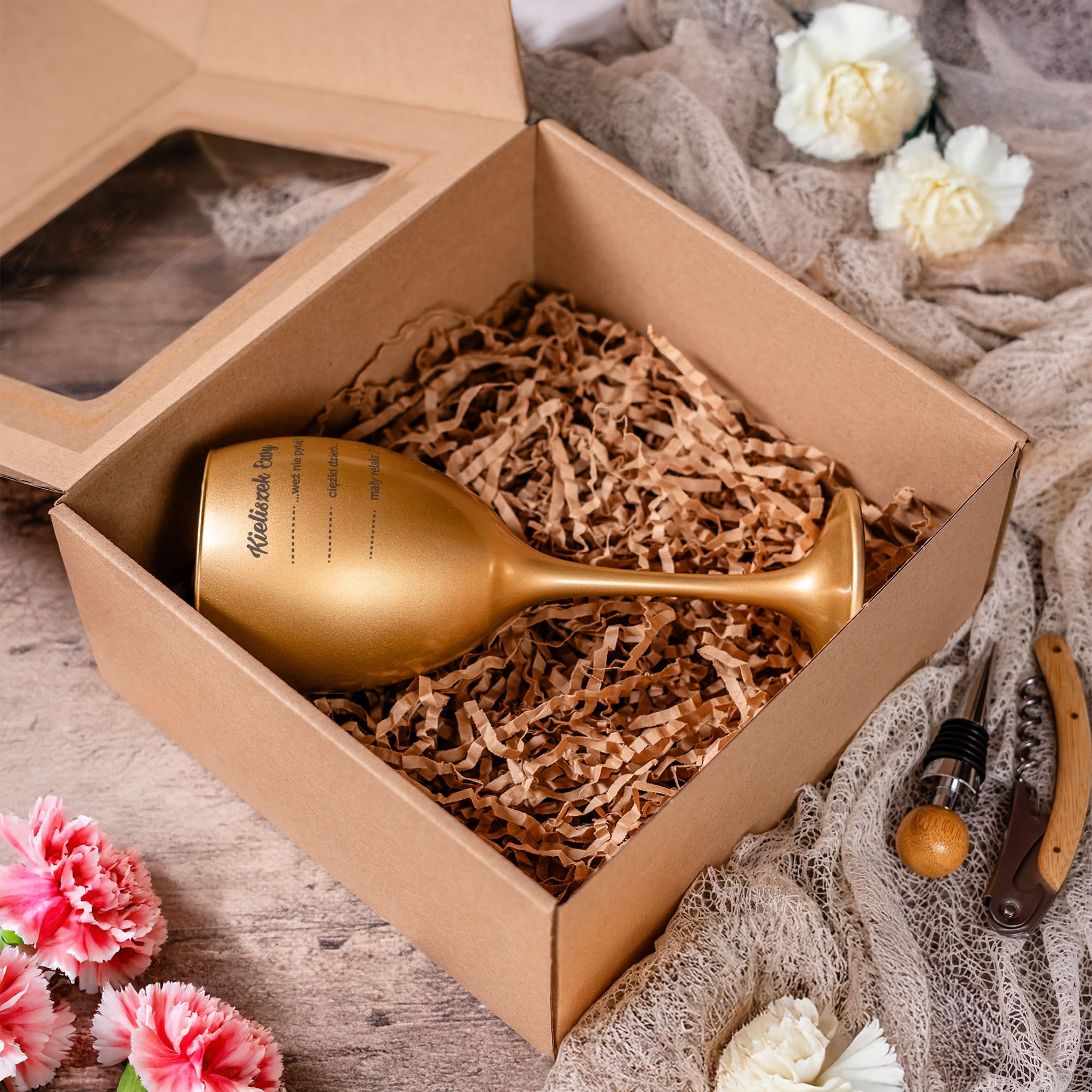 - Wypełnienie z eko wiórków – wnętrze pudełka wypełniamy ekowiórkami, aby kieliszek ładnie się prezentował i był zabezpieczony przed wstrząsami w momencie wręczania prezentu.